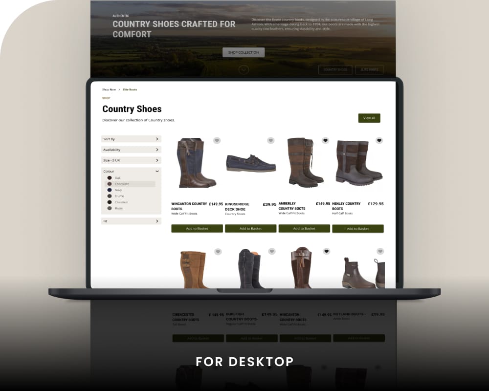 We built a fully bespoke, responsive e-commerce platform optimised for conversions across all devices, featuring custom product filtering and discovery tools that effectively showcase Cabotswood’s premium boots.